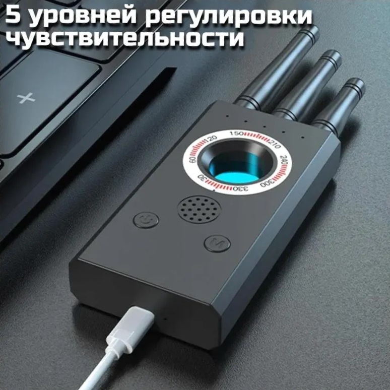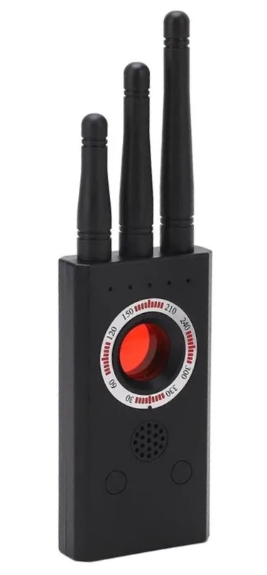 Устройство также позволяет обнаружить скрытые камеры наблюдения. Для их поиска воспользуйтесь встроенной в корпус прибора линзой и лазерными излучателями. Камеры часто прячут на книжных полках, под потолком (в светильниках, потолочной плитке), в углах и т.д. Включите лазерную подсветку и внимательно осмотрите место предполагаемой установки камеры через линзу. У любой камеры имеется объектив, который бликует при попадании на него света (даже если камера в данный момент неактивна). Если вы заметили яркий световой блик — значит в этом месте спрятана камера. С помощью кнопок переключайте режим мерцания излучателей, чтобы сделать поиск камер более эффективным.